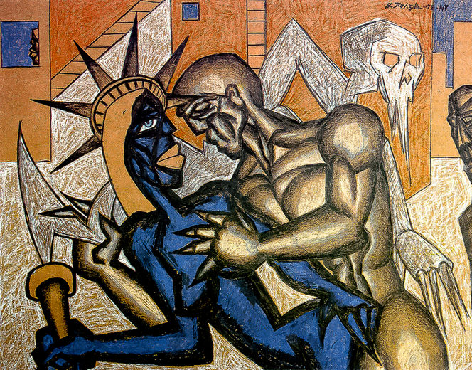 Gündelik zorunluluğun doğurduğu şiddetin kenti, New York’ta insanlar, insanlar, insanlar… İster sanatsal ifade alanında olsun, ister yaşamsal günlük alanda nereye gidersek gidelim göz ardı edemeyeceğimiz ve etmemiz gereken asal öğe; insanlar ya da bireyin kendisi. Durum böyleyken resim yapma edimi her şeyden önce figürü, açıkça insan bedenini ortaya koyma ve ifade etme dürtüsünü ve içtepisini dışavurur. Temel anlamda her ressam bendelerin, tenin ve organların renklendiricisidir.Çünkü ten boyadır, boya ise ten… Altı yüz yıllık resim tarihinde insan bedeninin varlığı bu diyalektiğe bağlı gelişen bir öznellikti. Bu nokta resim yapma ediminin yönünü çözümlediğine göre, her şeyden evvel new York’ta insnaları resmetmek önemliydi. Bir kez resmetme eylemini bu noktada düşünürsek, resim sanatında göz ve retine tabakasının yetersizliği fark edilecektir. Çünkü resim yapma ediminde üst bir bilince yani Tin’e (Us’a) ihtiyaç duyarız. Göz ve tinin ortak çalışması gerek bu noktada. Gördüklerimize usumuzla ne katabileceğimiz ve ne çıkarabildiğimiz önmeli. Her şey bu ince nüanasta çözümlenmekte; ifade ve ifadenin yetkinliğinde. İşte resmin sanatsal etkinliğinin ve kriterinin gerçek ölçüsü bu olmalı.